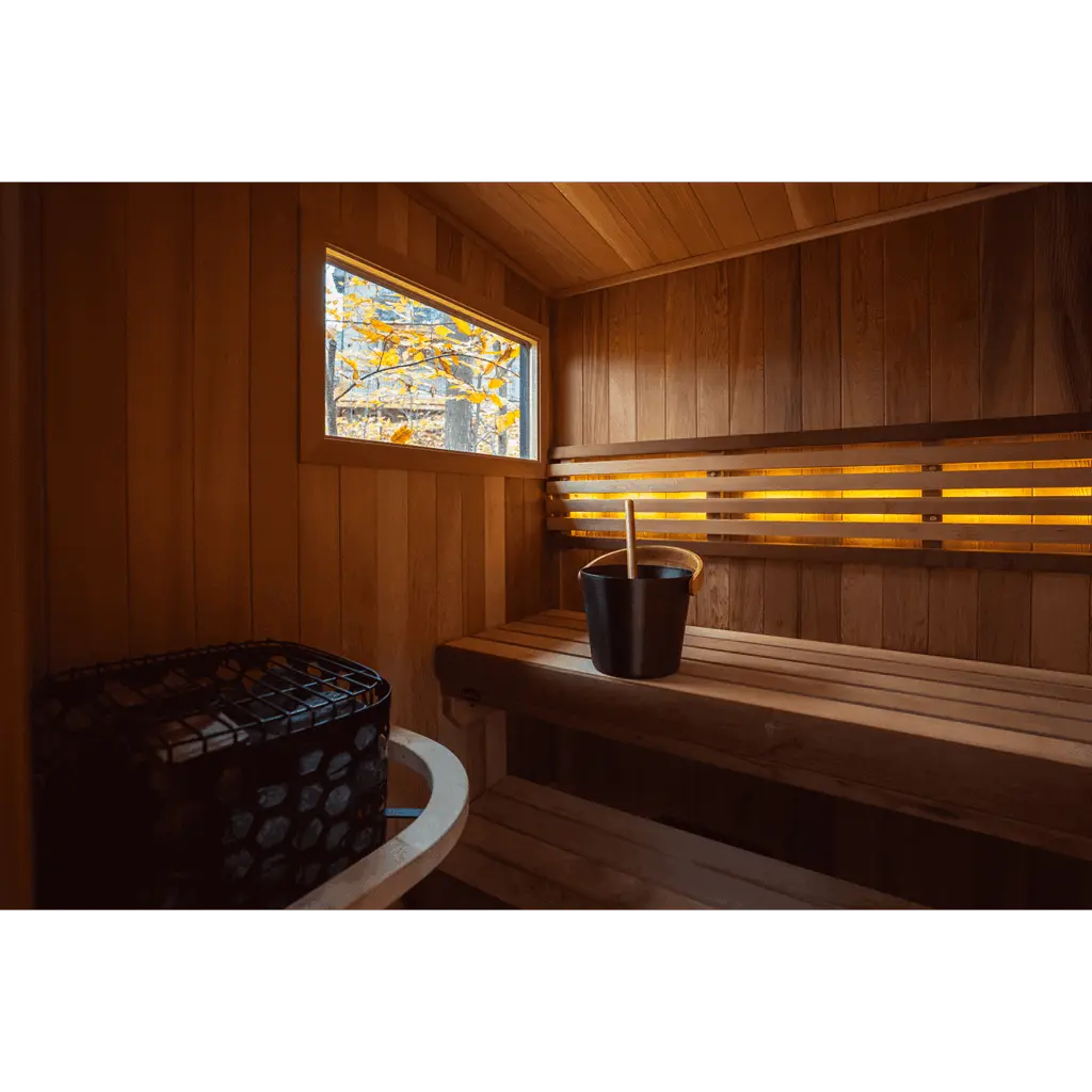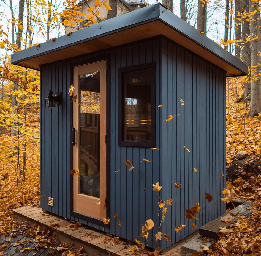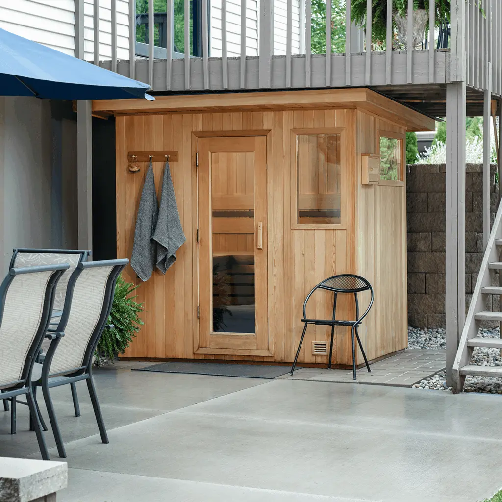Customizable outdoor sauna with 3 benches, floor included. The options are almost unlimited — innovative use of glass windows and doors, unique bench configurations, and more. With a custom Euro Outdoor sauna, you can create the perfect sauna to fit your backyard living dreams.