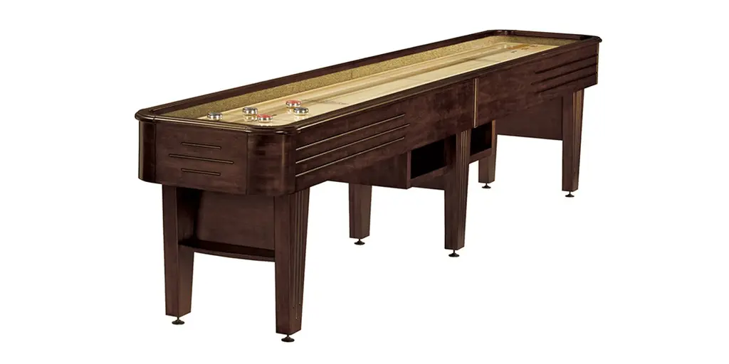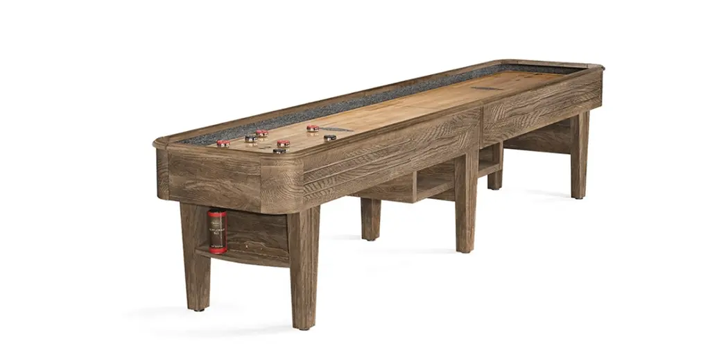 Available in 12- and 14-foot sizes with a contemporary espresso, driftwood or rustic dark brown finish. Features convenient storage shelves found at the center leg and accessories (including four black pucks, four red pucks, stainless abacus scorer, table brush, and Shuffleboard Wax), the Andover provides a unique visual complement to any home game room. Optional light set (set of two) sold separately.