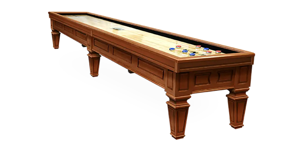 The Brentwood Shuffleboard Table is made from Solid Wood and features a routered panel cabinet design with classic tapered legs and router detail. All Olhausen Shuffleboards are hand-crafted at our 250,000 sq. ft. manufacturing facility in Portland, TN.