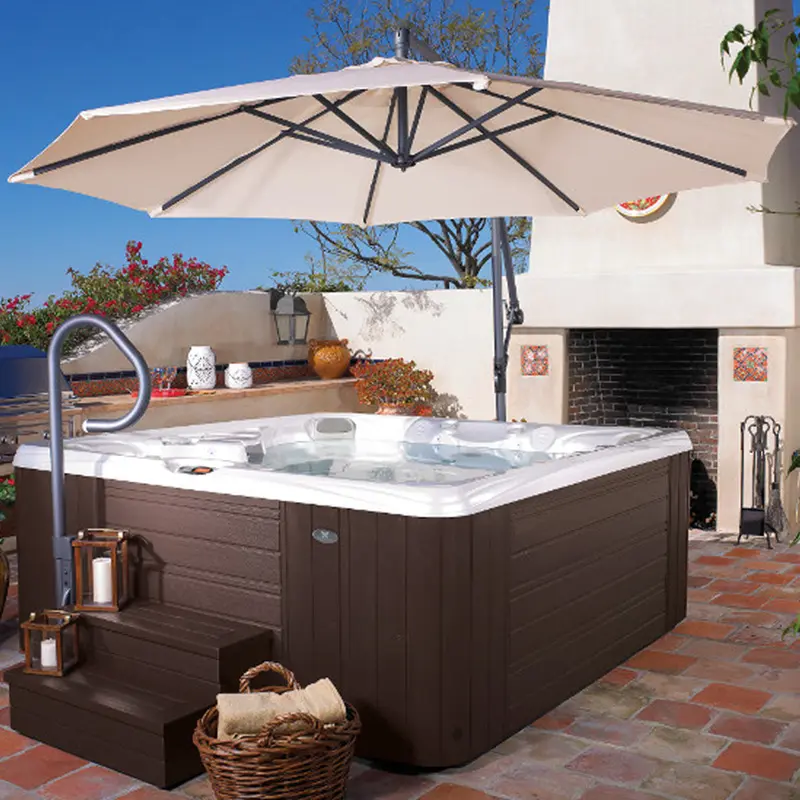 The large 9’9” diameter canopy of our hot tub umbrella pivots to cover either your spa or patio. The base slips under the spa cabinet to help provide stability.