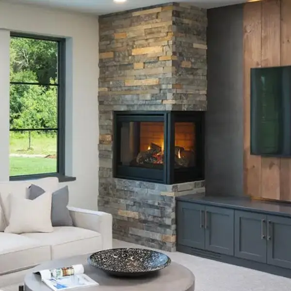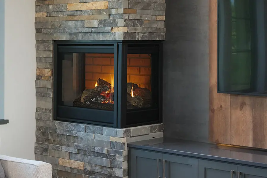 Add the atmosphere of fire into your room in a new way. The Corner Two-Sided gas fireplace brings an unused space to life, either left- or right-facing. It is a novel way to visual punch to tighter spaces.