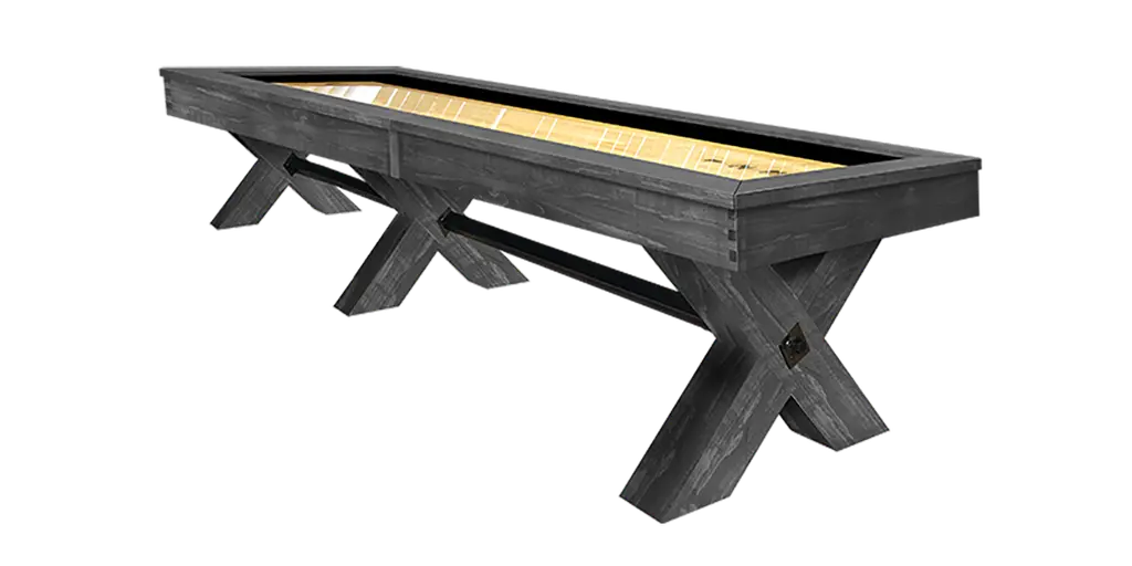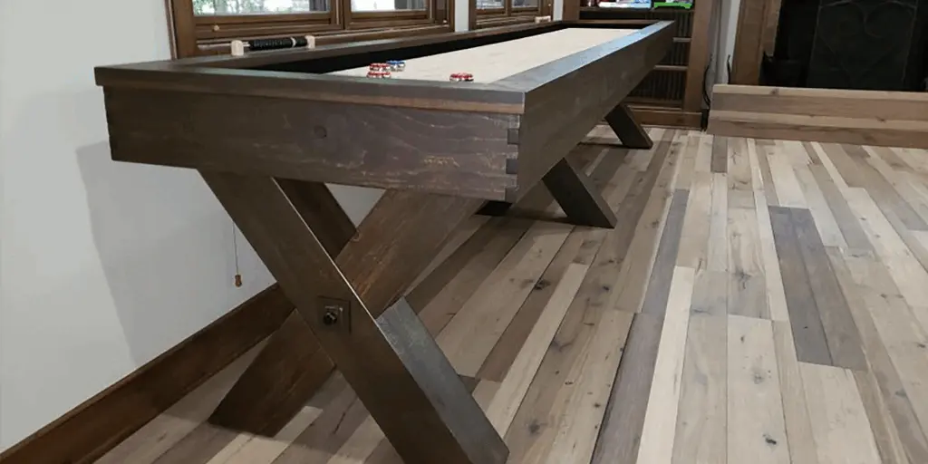 The Durango Shuffleboard Table is made from Solid Pine and features natural characteristics of live edge wood along with band-saw distressing and rustic bolt accents on the legs. All Olhausen Shuffleboards are hand-crafted at our 250,000 sq. ft. manufacturing facility in Portland, TN.