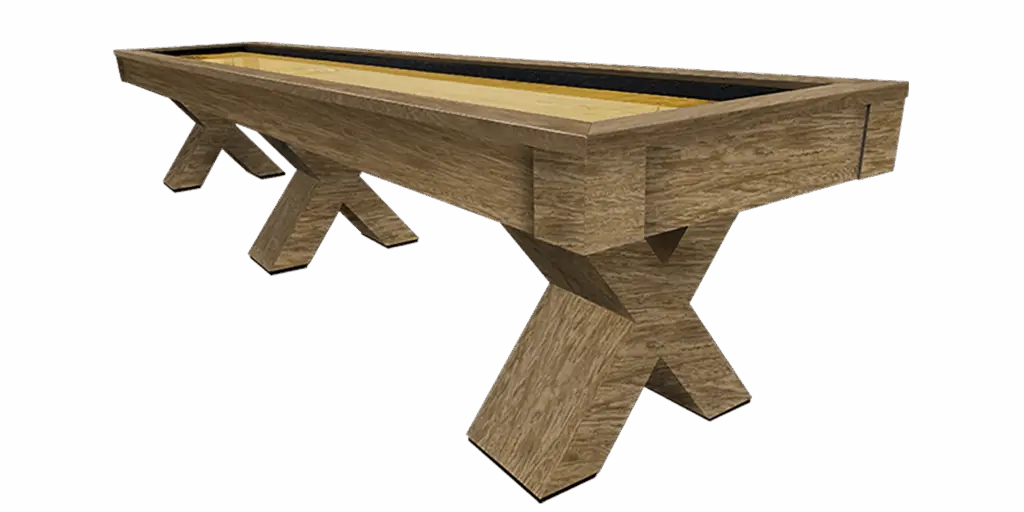 The Encore Shuffleboard Table is made from Solid Wood and features flat panel aprons and unique “X” style legs. All Olhausen Shuffleboards are hand-crafted at our 250,000 sq. ft. manufacturing facility in Portland, TN.