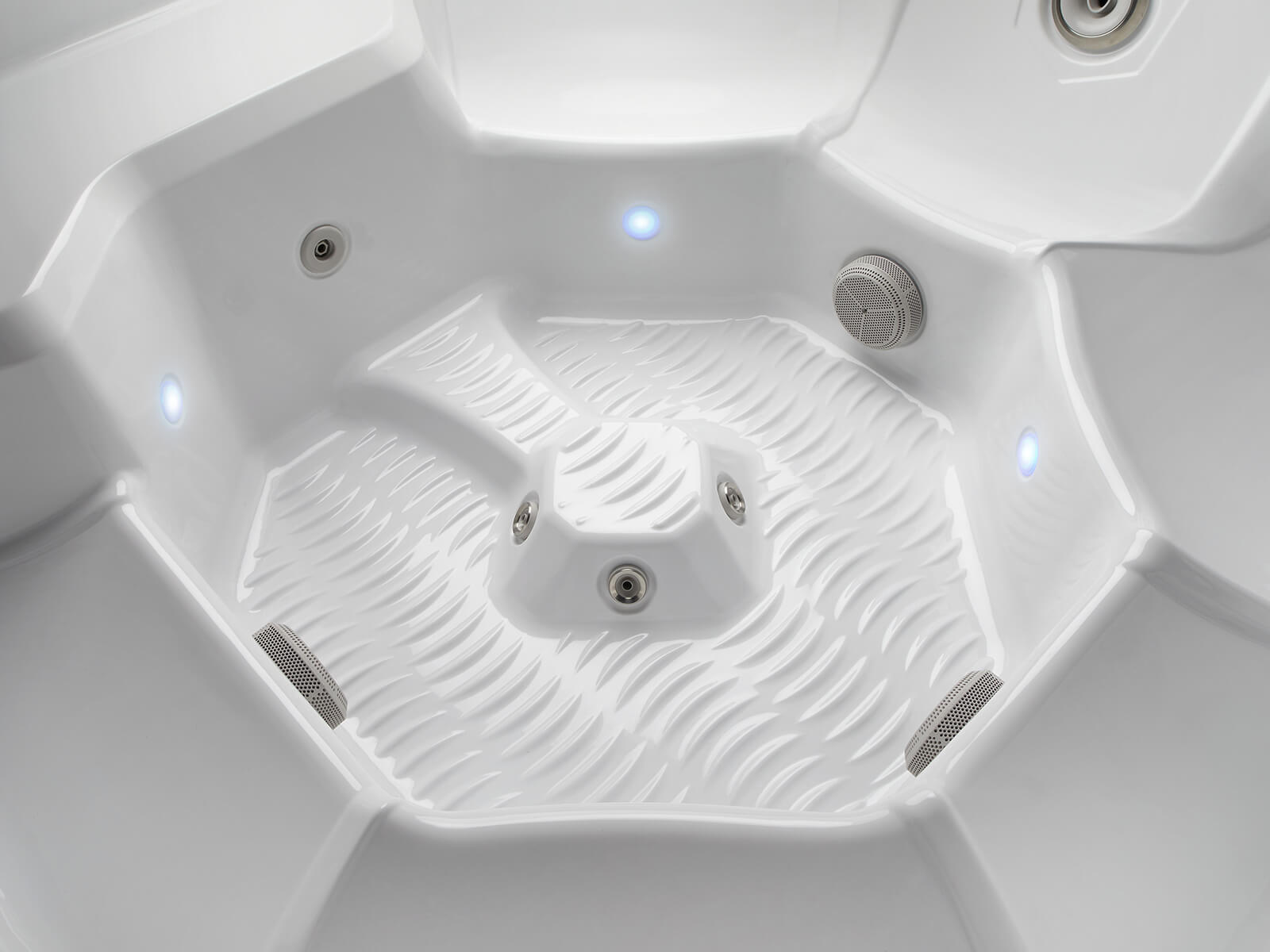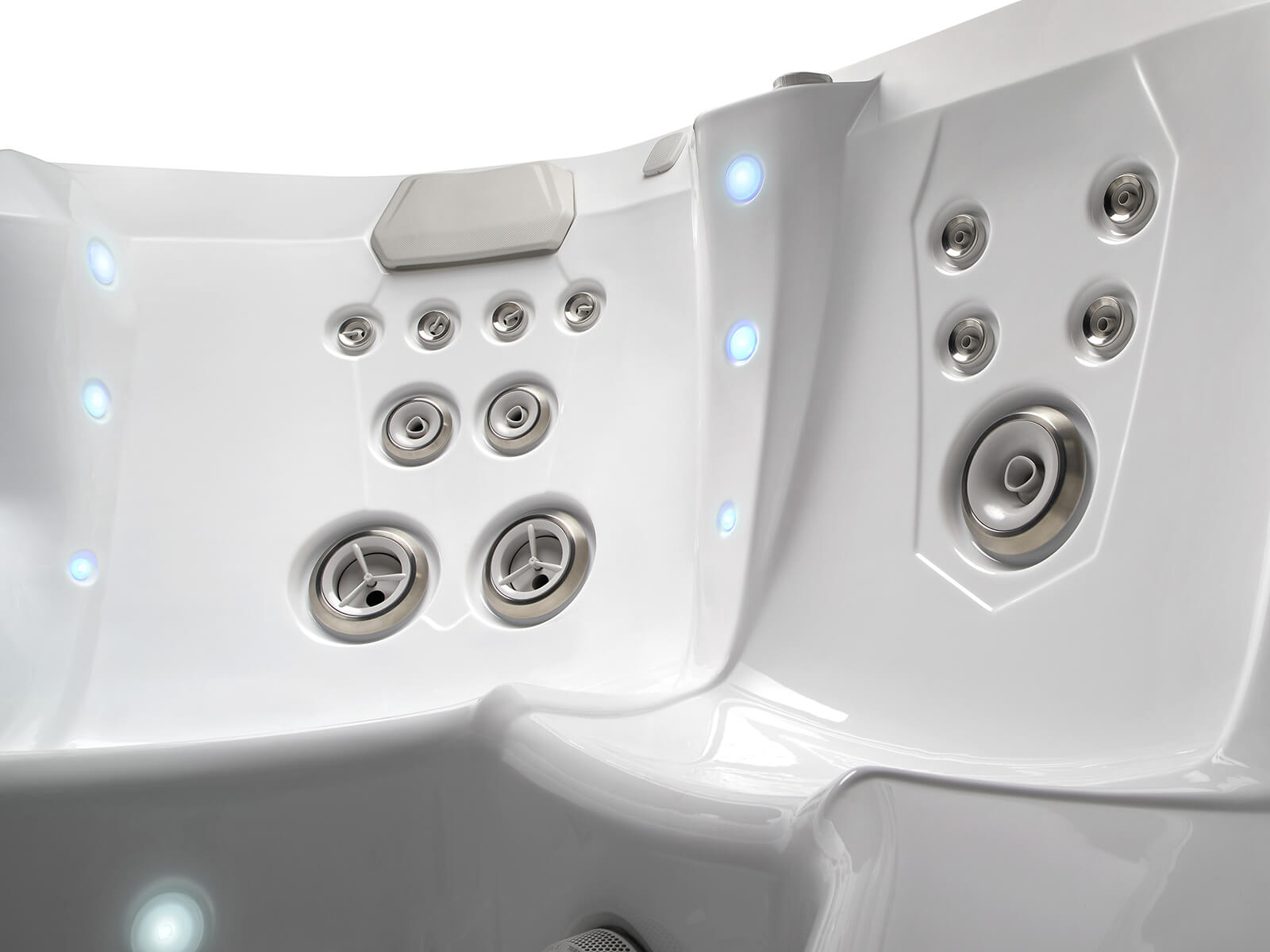 The interior lighting system features multiple points of LED light that accent the contours of the spa shell. Two exterior LED lights integrate with the front corners of the spa, creating an elegant look.