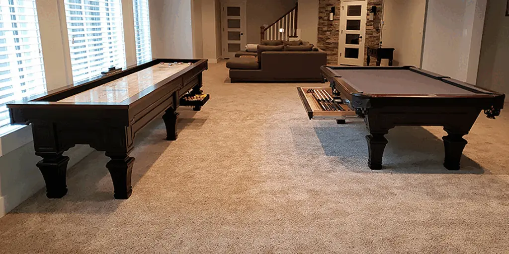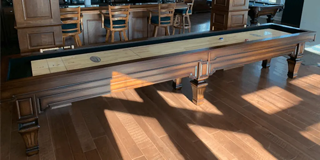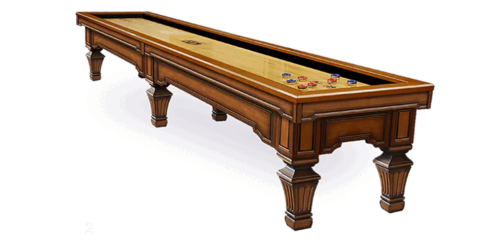 The Hampton Shuffleboard Table is made from Solid Wood and features a routered panel cabinet design with fluted tapered legs and router detail. All Olhausen Shuffleboards are hand-crafted at our 250,000 sq. ft. manufacturing facility in Portland, TN.