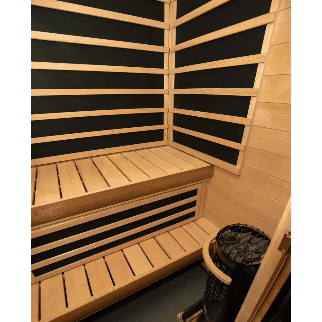 For those who sauna bathe alone, or with one other — or for those who have limited space, the diminutive IS440 two-person sauna just might be the best value in the market today. The IS440 comes complete with a two-in-one InfraSauna dual heating system comprised of our low EMR/EF infrared heating panels as well as the Piccolo Mini traditional sauna heater. Simply assemble and plug into a 120-volt household outlet.