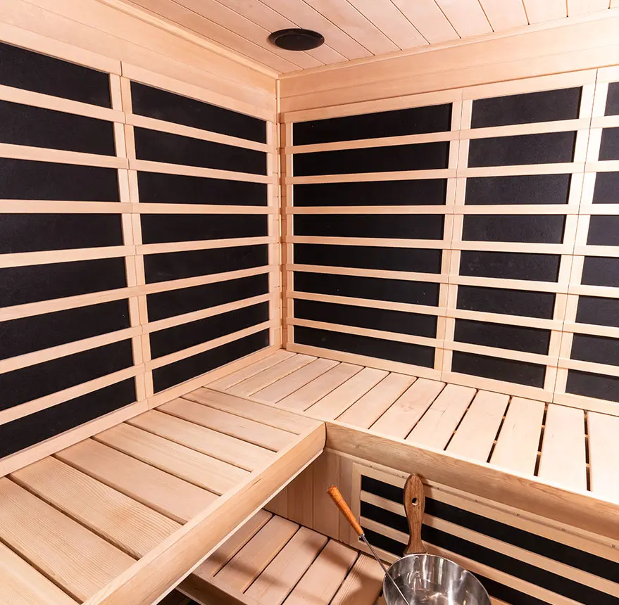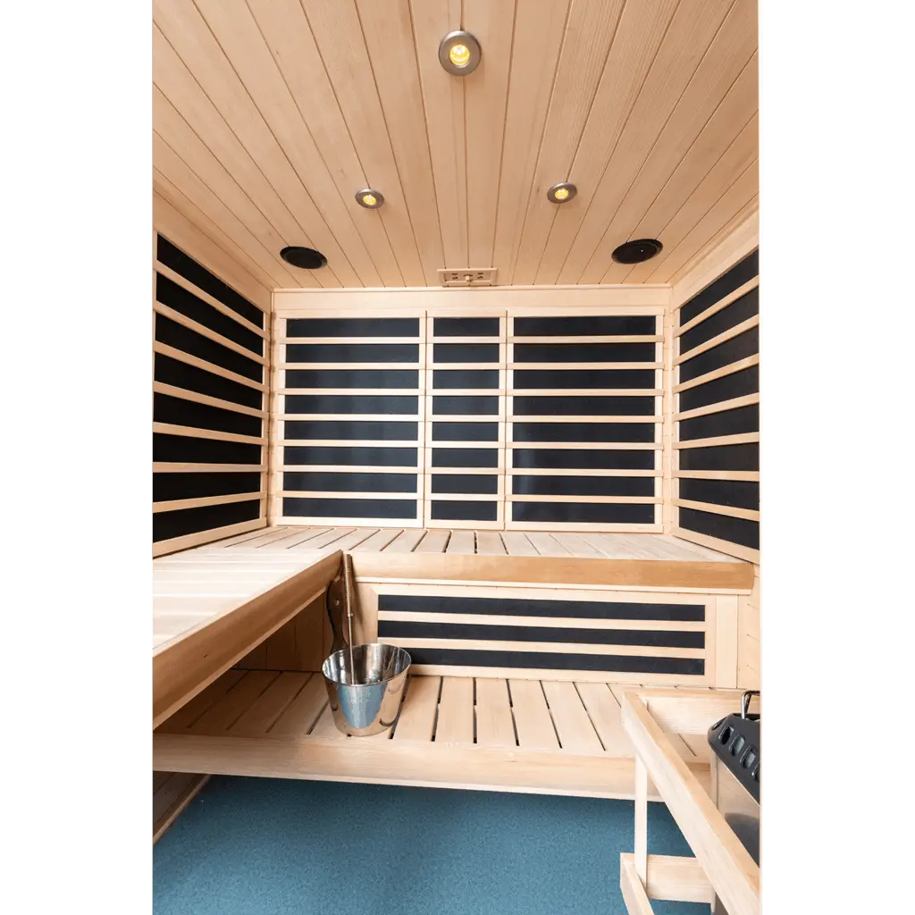 The IS565 is large enough to seat up to 5 adults, or two adults lying down. This hybrid sauna features infrared or traditional use (the bather decides) in a family size sauna. The unit is self-contained requiring no special flooring or plumbing needed. Simply hard wire to a 240V 30-amp breaker and enjoy.
