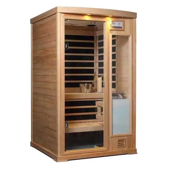 For those who sauna bathe alone, or with one other — or for those who have limited space, the diminutive Hallmark IS44, 4’x 4’ two person sauna just might be the best value in the market today. The IS44 comes complete, from the factory, with a “Two-in-One InfraSauna Dual Heating System” of Finnleo’s Low EMR/EF Infrared heating panels as well as a stainless steel traditional sauna heater. Simply assemble and plug in to a 120 volt household outlet. The SaunaLogic control panel allows you to easily select “Infrared” or “Traditional” sauna, depending upon what you’re in the mood for.