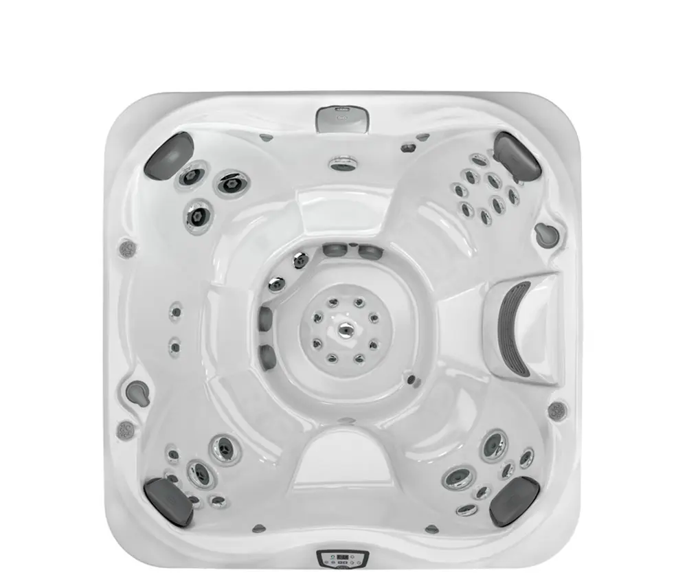 The square J-345™ Hot Tub is moderate in size Features PowerPro® jets Delivers relaxing massage in the PowerPro® Therapy Seat Distinguish by sophisticated ProFinish™ cabinetry with optional corner accent lighting Easy-to-use control panel HydroSoothe™ no-splash jetted massage pillow.