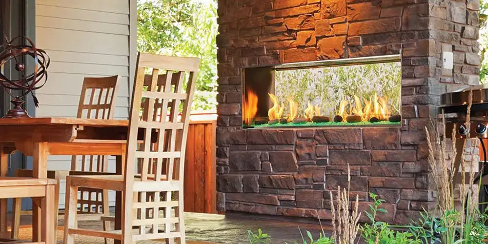 Enhance the atmosphere of both your inside and outside spaces with our premium Lanai 48" see-through outdoor gas fireplace. Stainless steel reflects the end-to-end flames and accent lighting as you gather with family and friends.