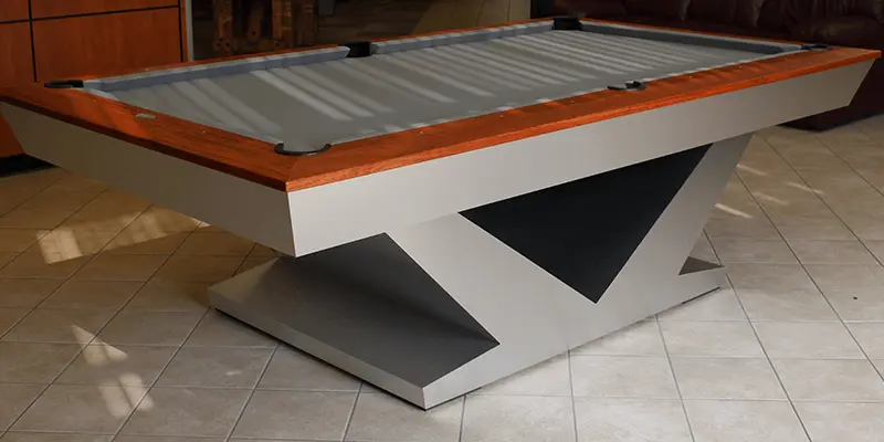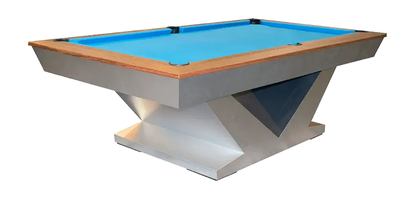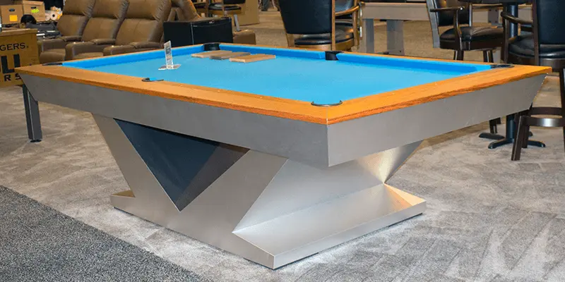 The Landmark Pool table features modern style enclosed solid wood rail system with flat paneled apron with pedestal base legs in brushed aluminum. All Olhausen Pool tables are hand-crafted at our 250,000 sq. ft. manufacturing facility in Portland, TN and feature Accu-Fast Cushions and our Lifetime Warranty.