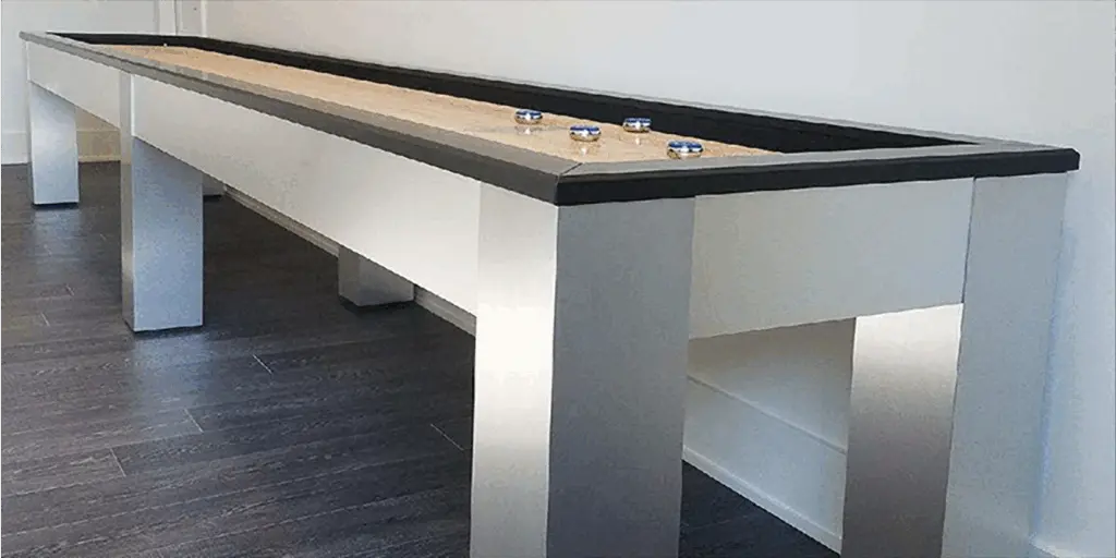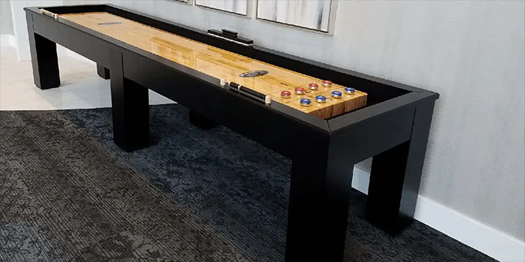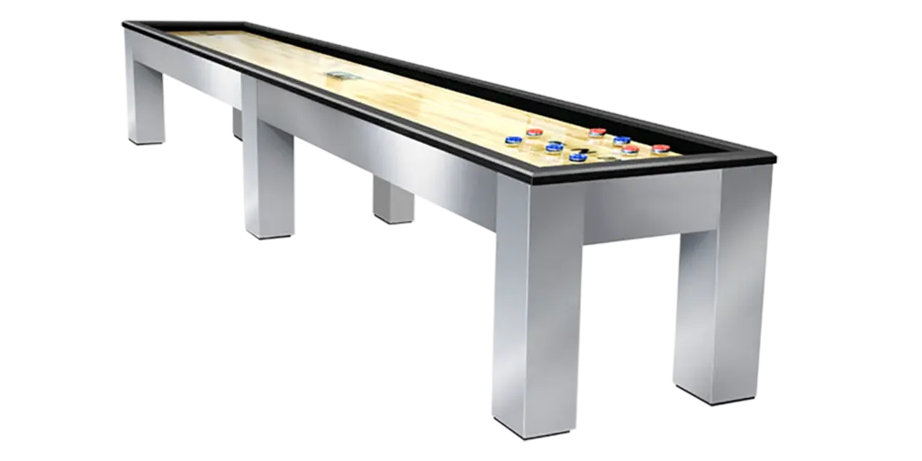 The Madison Shuffleboard Table is made from Solid Wood and features flat paneled cabinet and pedestal base legs. All Olhausen Shuffleboards are hand-crafted at our 250,000 sq. ft. manufacturing facility in Portland, TN.