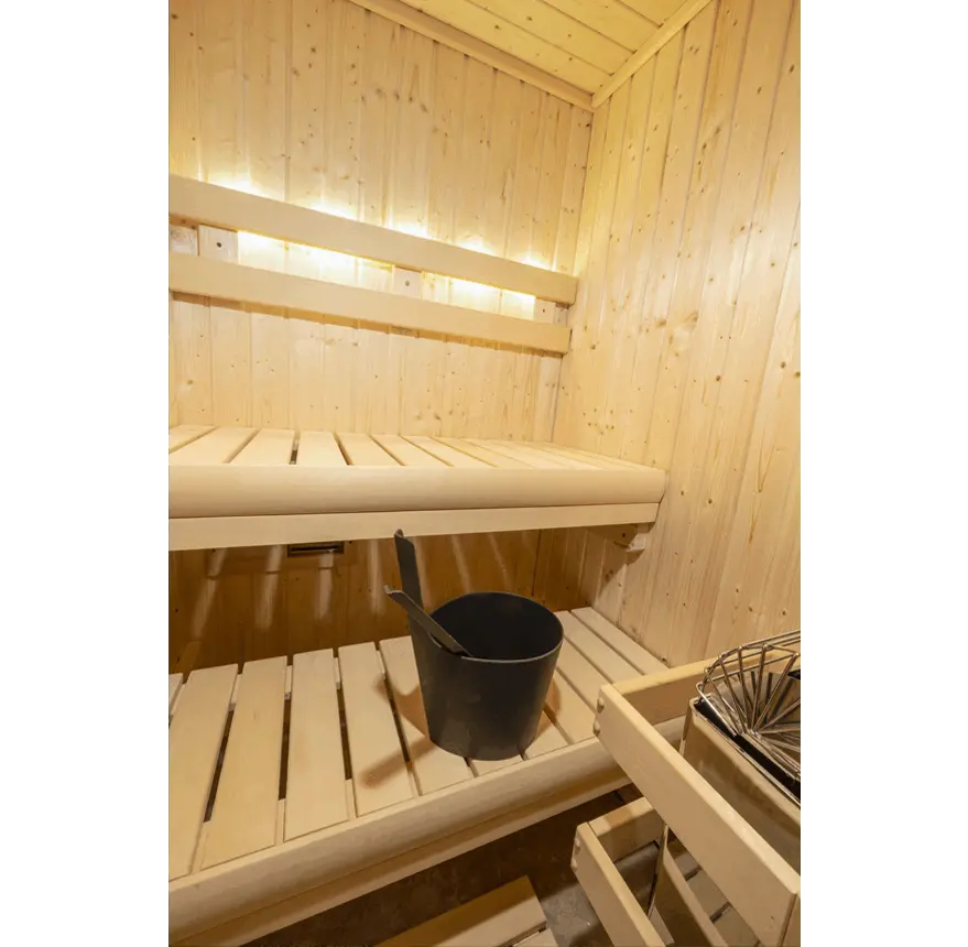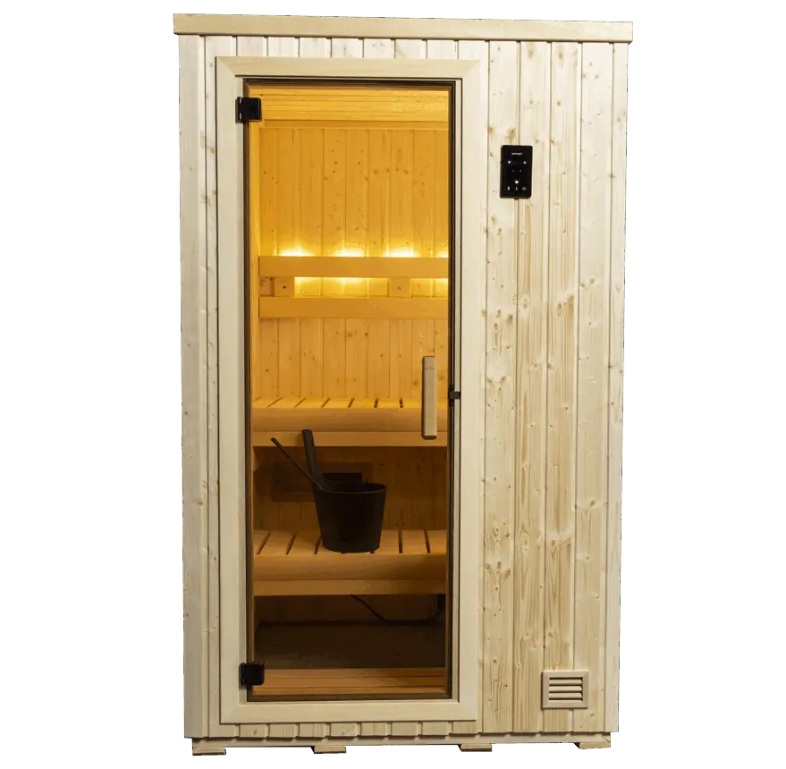 With the NSI-44, a true Finnish sauna experience is possible in only 16 sq. ft. of floor space. The NSI-44 comes equipped with the same features as other NorthStar saunas, but with the 120-volt stainless steel “Junior” heater (1.7 kW or 2.2 kW/120V/with cord/plug) instead of a 240-volt heater.