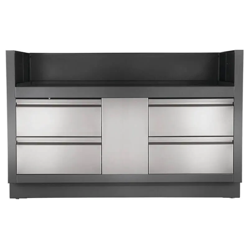 Specially made for the Built-In Prestige™ PRO 825 Gas Grill Head, this carbon colored powder coated, galvanneal cabinetry features increased durability from the two-coat pebbling, finishing system. A dual bank of stainless steel drawers are mounted on smooth gliding tracks for under grill storage. Installation is a breeze with knockouts for gas and electrical. Levelling feet ensure a balanced surface, even if your patio isn't perfectly level.