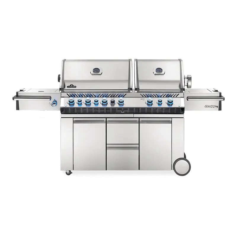Napoleon's Prestige PRO™ 825 Propane Gas Grill with a Power Side Burner and Infrared Rear and Bottom Burners proves that two heads are better than one. On the outside, a shining stainless steel body provides durability against the elements while chrome details add luxury. The LED Spectrum NIGHT LIGHT™ Control Knobs have near limitless color options making night-time entertaining a breeze; they also glow red when the gas is left on as a safety feature. You'll know it's a Napoleon with the iconic WAVE™ cooking grids for those distinctive sear marks. The main grill head is big enough to grill for a crowd and provides loads of gas powered cooking, including turning your grill into a smoker with the integrated smoker tube and dedicated burner. The second head features two ceramic infrared burners that reach high heat in seconds, ideal for searing restaurant quality steaks. The Prestige PRO™ 825 also has a two-stage power side burner with a reversible cooking grid ideal for sauces, sautes and side dishes. Enjoy evenly cooked restaurant style meals with the rear infrared burners and rotisserie.