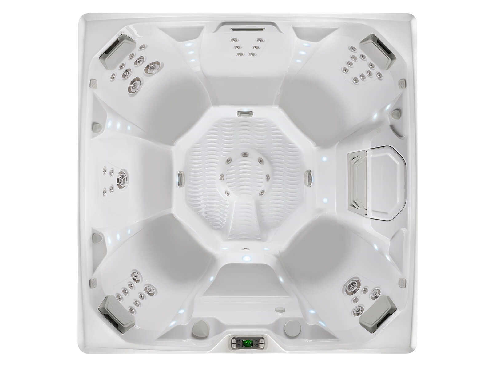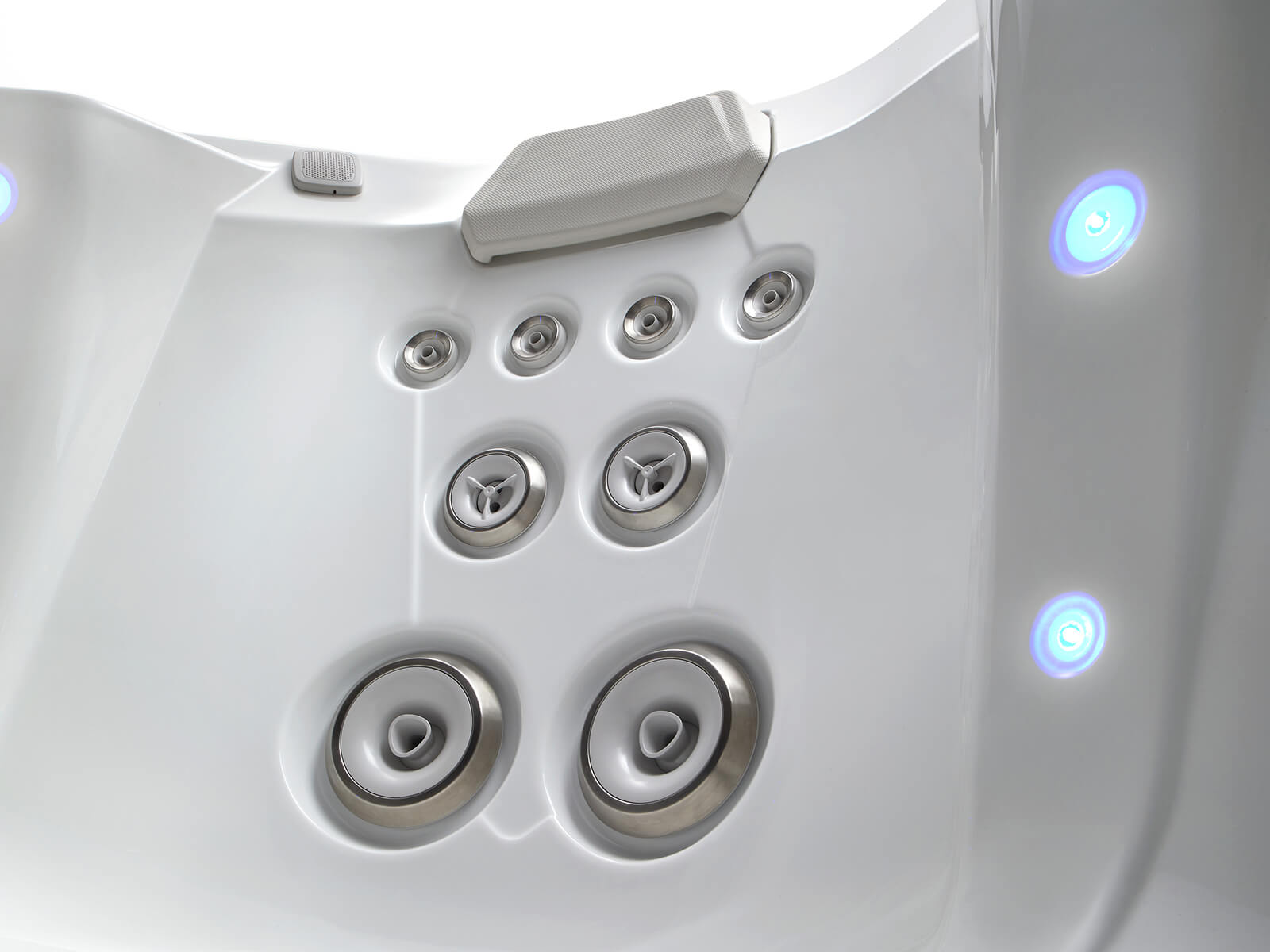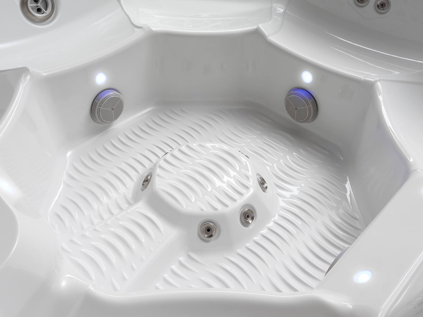 The interior lighting system features multiple points of LED light that accent the contours of the spa shell. Two exterior LED lights integrate with the front corners of the spa, creating an elegant look.