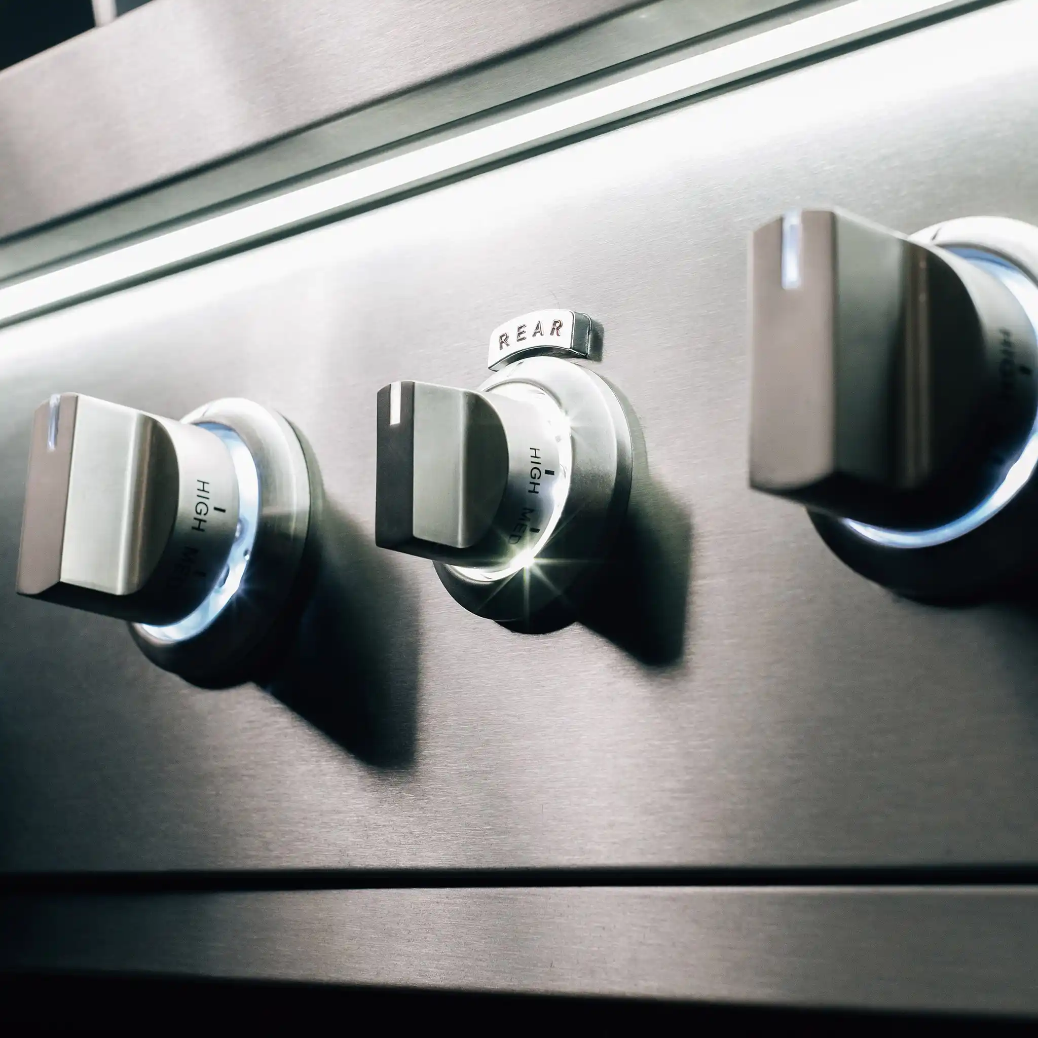 - Waterfall LED Front Panel Lighting, White to Red Bezel Lighting ON/OFF Burner State, and Halogen interior Cooking Lights