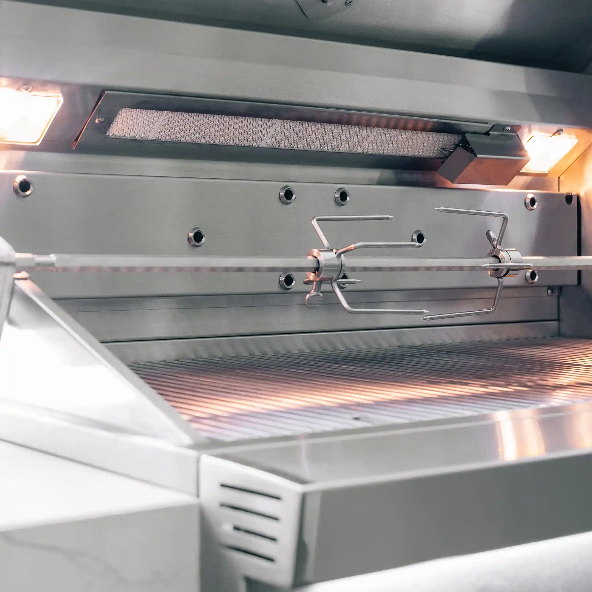 - Comes fully equipped with a Drop-In Griddle Plate, Smoker Box, Rib Rack, Rotisserie Kit, and Multi-Position Warming Rack