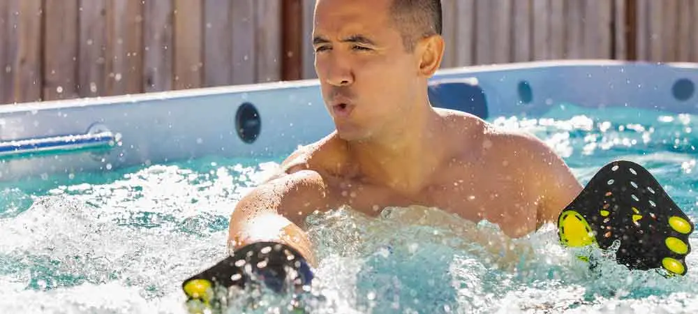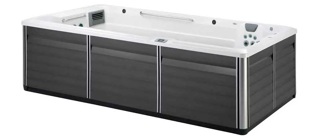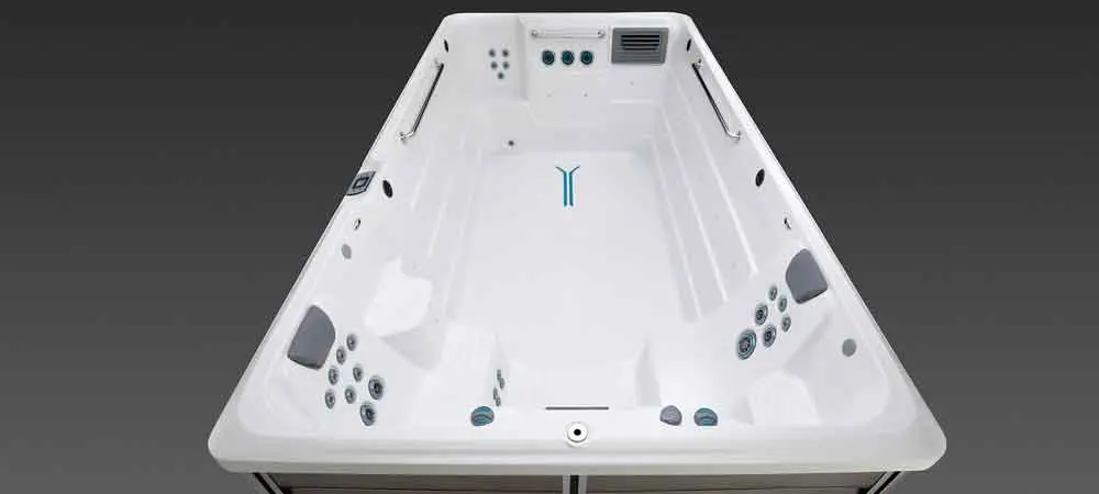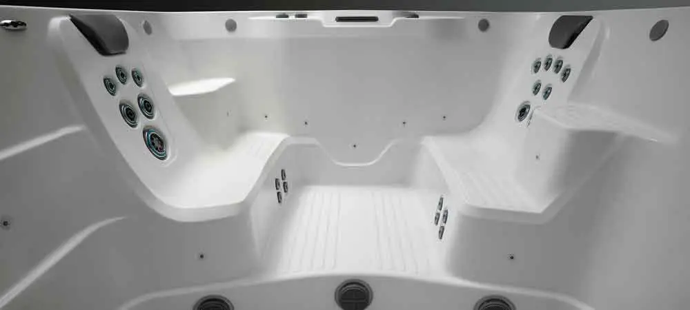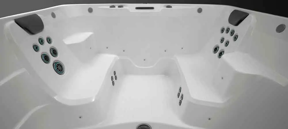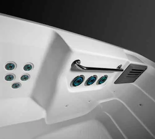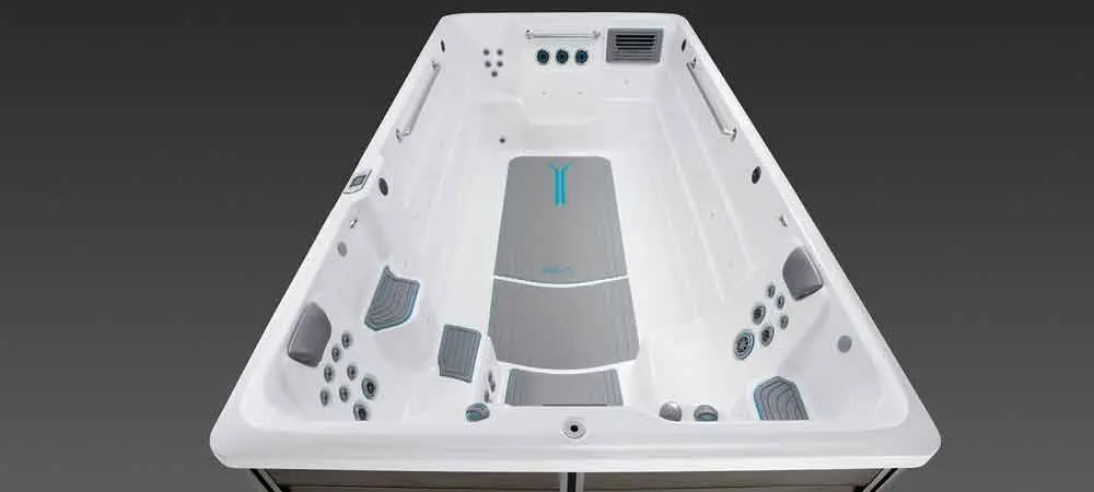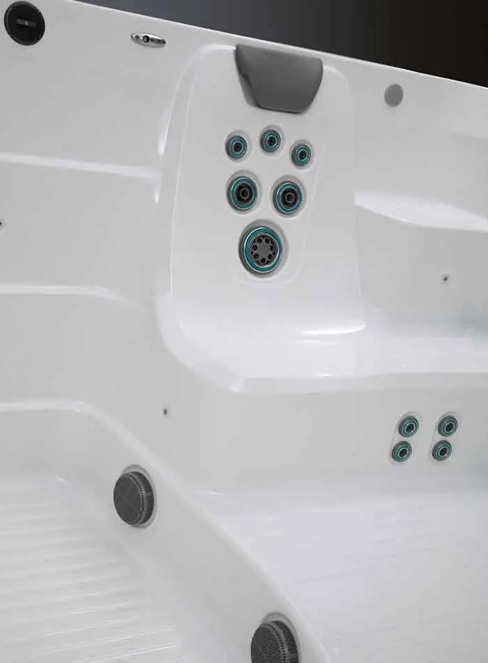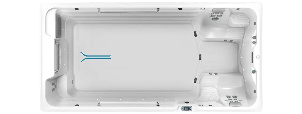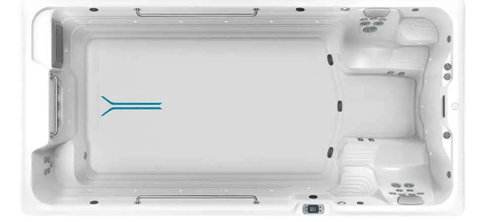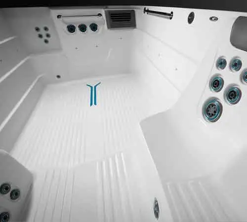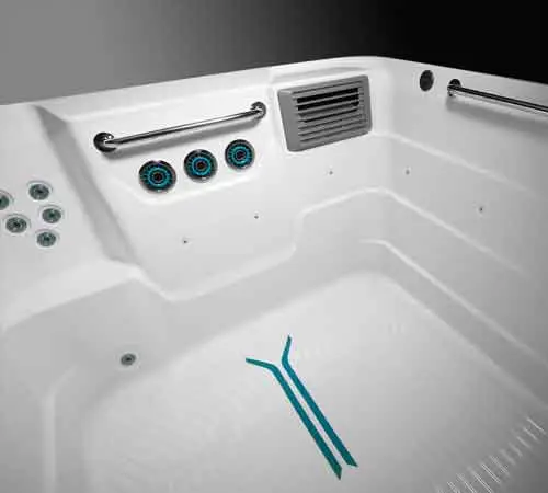Three airless swim jets provide ideal resistance for workouts and tethered swimming. When you reach your limit, five ergonomic spa seats with 27 hydromassage jets are waiting to help you unwind. The kids can stay close with plenty of room for them to splash and play with the 30"-deep reef between the R500's bucket seats.