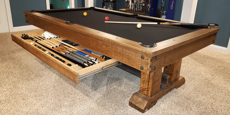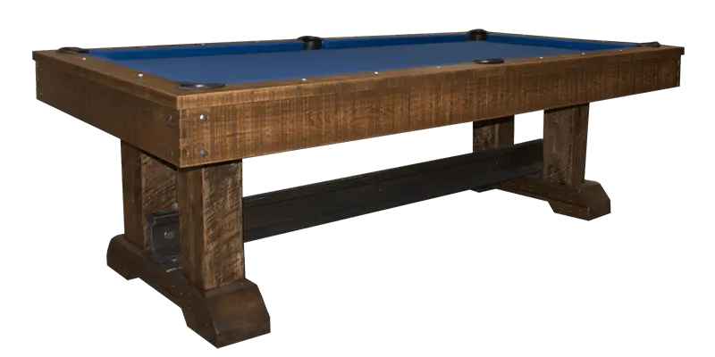 The Railyard Pool table is made from reclaimed train rail and re-purposed hardwood timbers from century old railroads.. All Olhausen Pool tables are hand-crafted at our 250,000 sq. ft. manufacturing facility in Portland, TN and feature Accu-Fast Cushions and our Lifetime Warranty.