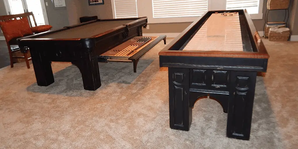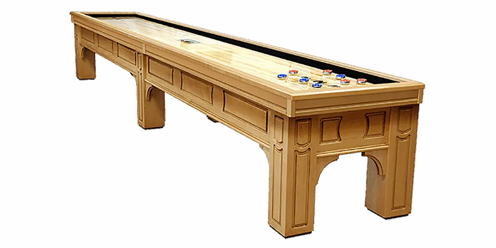 The Remington Shuffleboard Table is made from Solid Wood and features flat paneled cabinet and pedestal base legs. All Olhausen Shuffleboards are hand-crafted at our 250,000 sq. ft. manufacturing facility in Portland, TN.