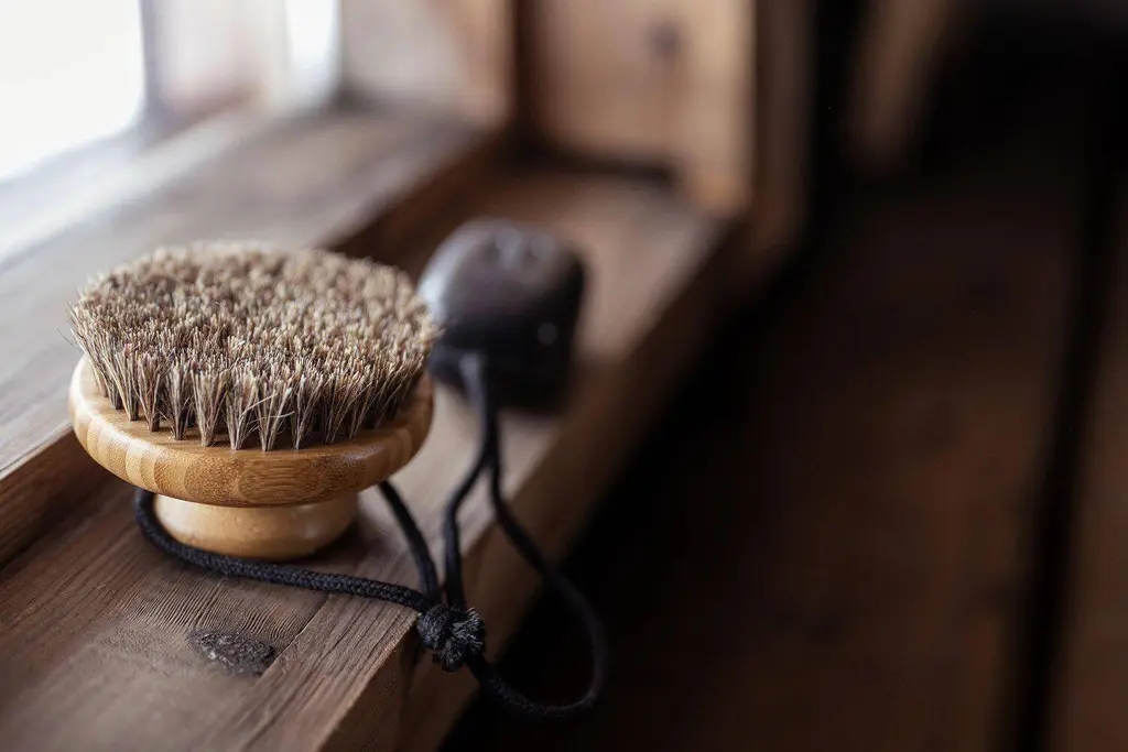 This low-profile, mildly abrasive round brush is easy to grab and use throughout your body. Perfect for dry brushing after sauna, before showering.