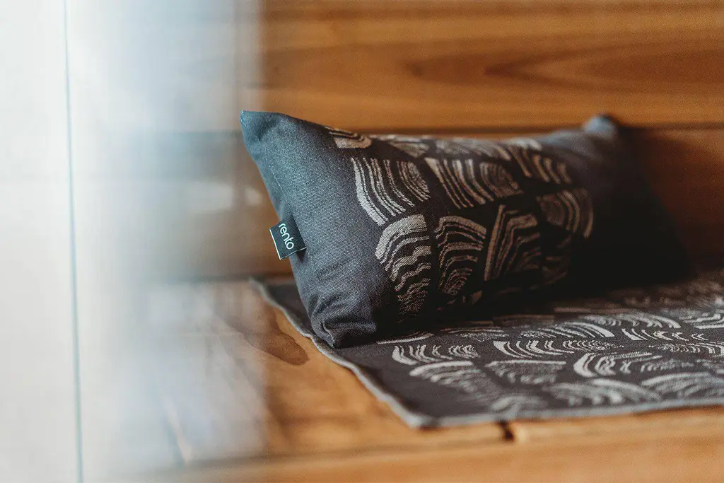 Rento's black Pino Sauna Pillow is made of a soft, light cotton that is jacquard-woven, making it perfect for both head/neck support and long-lasting sauna use. The cotton has a welcome coolness against the skin, plus it absorbs moisture well and dries quickly thanks in large part to it's fast-drying wadding.