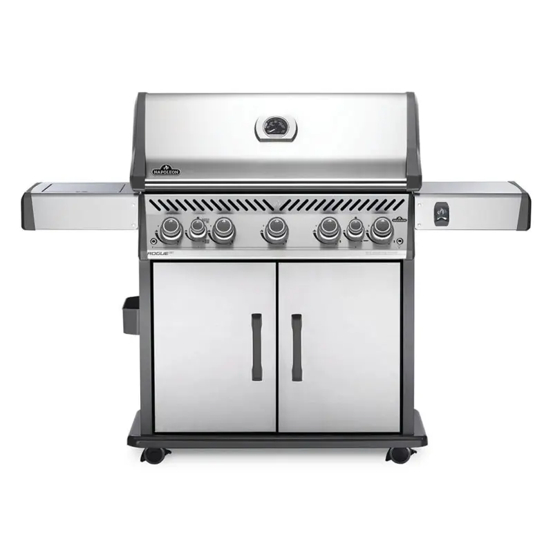 The Napoleon Rogue® SE 625 Stainless Steel Propane Gas Grill with Infrared Side Burner and Rear Burner is a durable stainless steel grill. Featuring five main burners, a rear rotisserie burner, and a high top lid, this grill has everything you need to create gourmet meals. Sear restaurant-style steaks on the integrated sear station, while generous side shelves provide plenty of prep space.