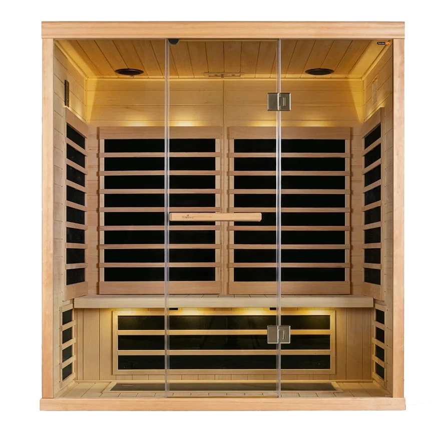 If you like to lie down in the sauna, this is the model for you. This rectangular model comfortably seats three, but the 6’ width also makes it comfortable for lying down. With the all glass front the room has an open, luxurious feel to it.