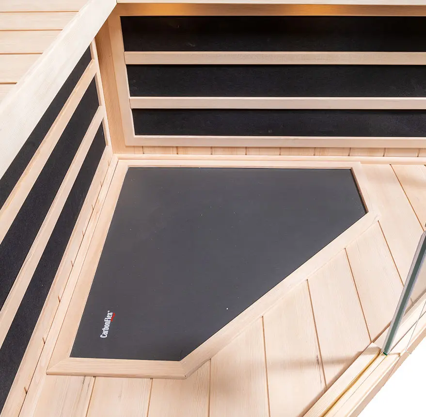 Our most luxurious model, the S-880 is a neo-angled beauty. A 3-sided all glass front gives the sauna panoramic openness. Comfortable seating for four, its L-bench design is ideal for intimate conversation with friends and family.