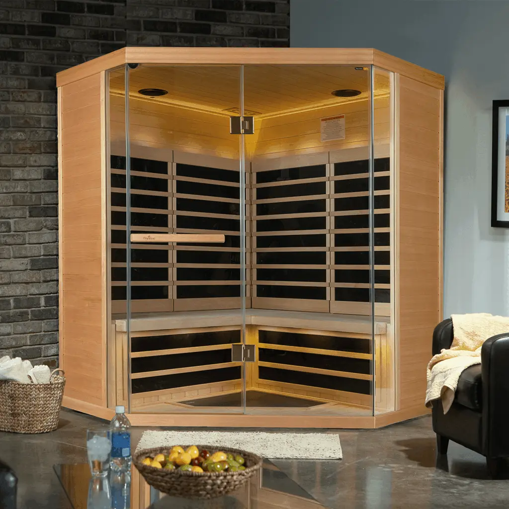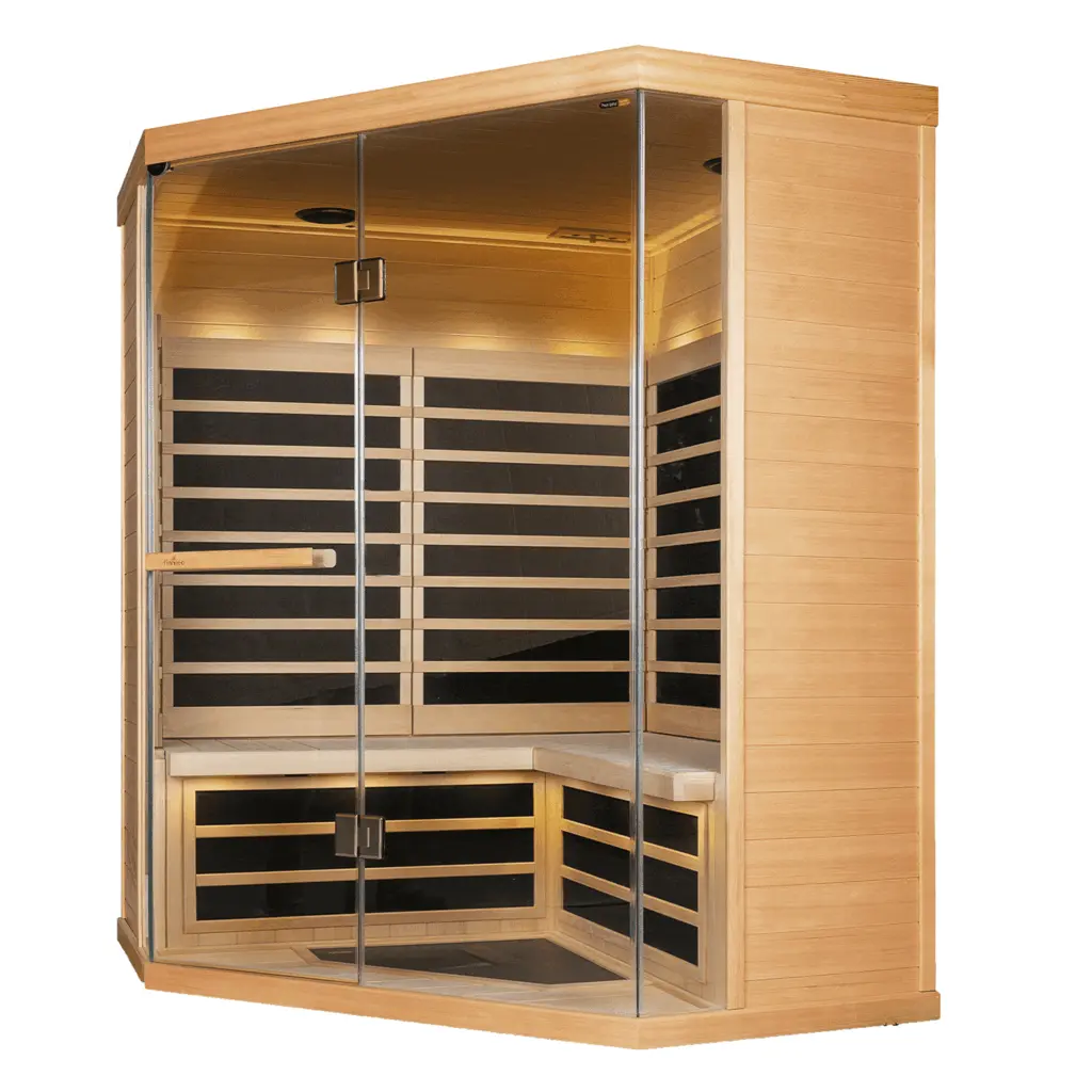 Our most luxurious model, the S-880 is a neo-angled beauty. A 3-sided all glass front gives the sauna panoramic openness. Comfortable seating for four, its L-bench design is ideal for intimate conversation with friends and family.