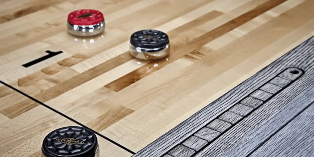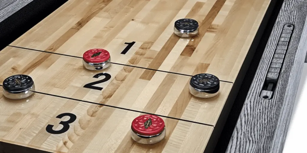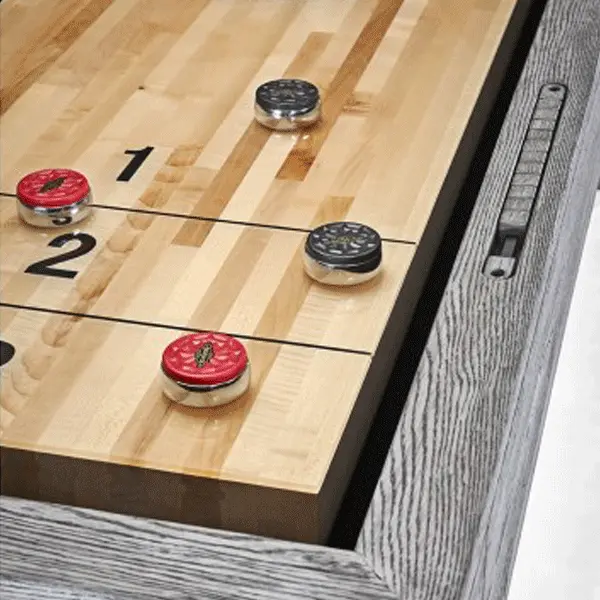 - Accessories include four black weights, four red weights, built-in abacus scoring system, table brush, and shuffleboard wax