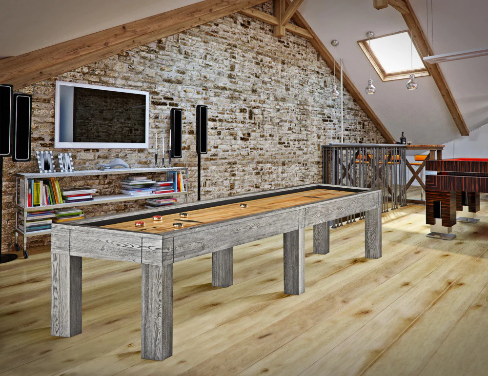 The Sanibel shuffleboard table features a modern design with ultra clean lines and minimalist aesthetic- a perfect match to the best-selling Sanibel Billiards Table. The Sanibel is available in Rustic Grey or Rustic Dark Brown finishes and offers a 12' or 14' play surface that promises to deliver quality and playability.