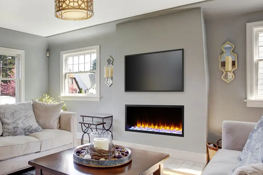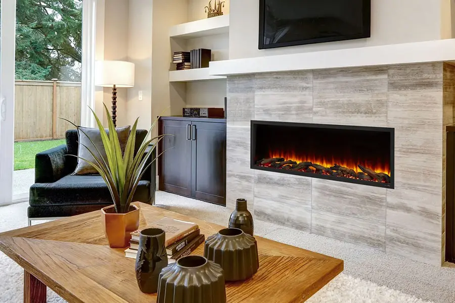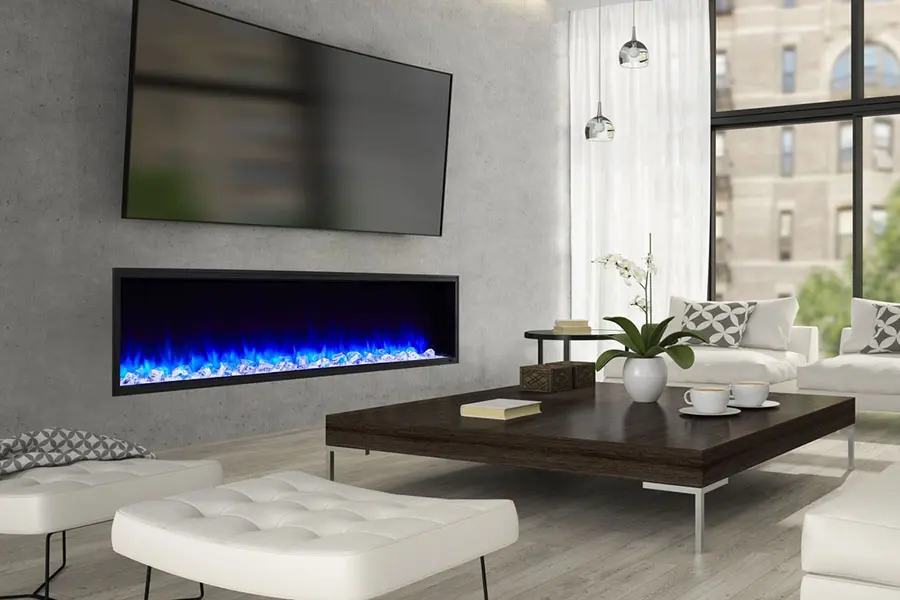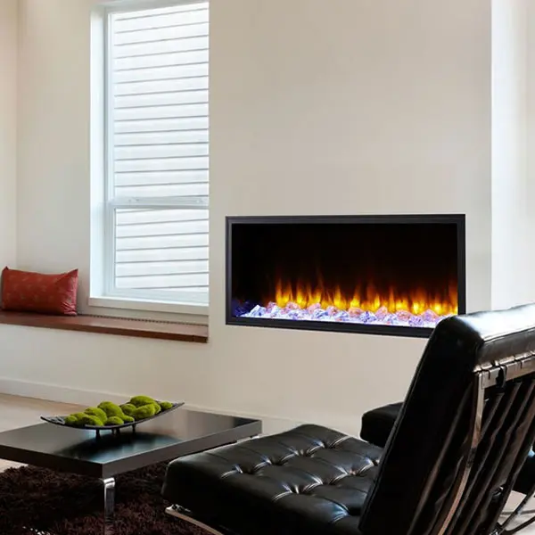 Experience luxury living in our sleekest fireplace design. The Scion modern electric fireplace brings finishing materials up to the edge, while clear crystals driftwood logs, LED flames, and ember colors reflect you.