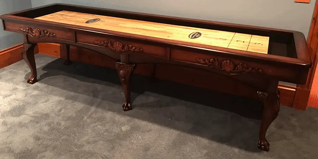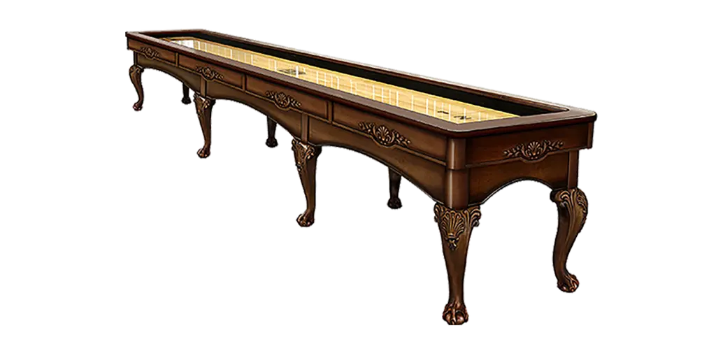 The St Andrews I Shuffleboard Table is made Solid Wood and features ornate carving details on cabinet and legs. All Olhausen Shuffleboards are hand-crafted at our 250,000 sq. ft. manufacturing facility in Portland, TN.