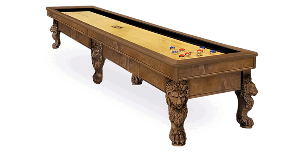 The St. George Shuffleboard Table is made Solid Wood and features ornate carving details on cabinet and legs. All Olhausen Shuffleboards are hand-crafted at our 250,000 sq. ft. manufacturing facility in Portland, TN.