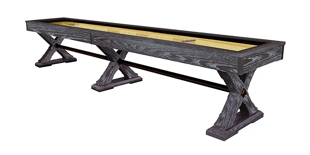 The Tustin Shuffleboard table is made from Solid Oak and features flat panel aprons with unique style legs with a metal cross bar. All Olhausen Shuffleboards are hand-crafted at our 250,000 sq. ft. manufacturing facility in Portland, TN.