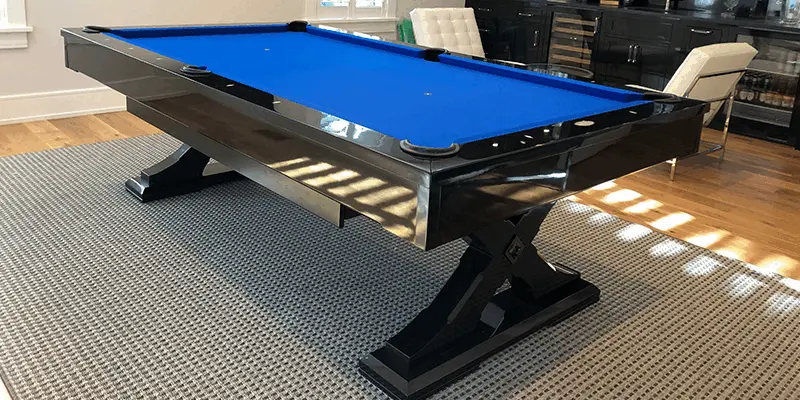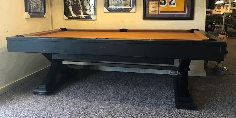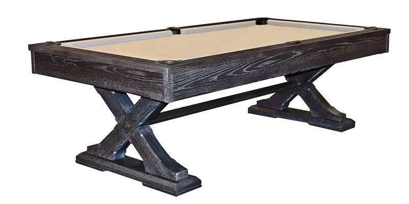 The Tustin Pool table is made from Solid Wood and features flat panel aprons with unique style legs with a metal cross bar. All Olhausen Pool tables are hand-crafted at our 250,000 sq. ft. manufacturing facility in Portland, TN and feature Accu-Fast Cushions and our Lifetime Warranty.