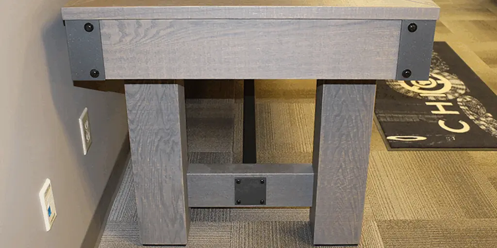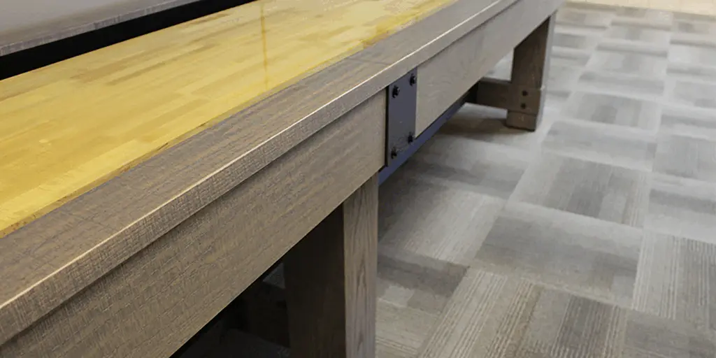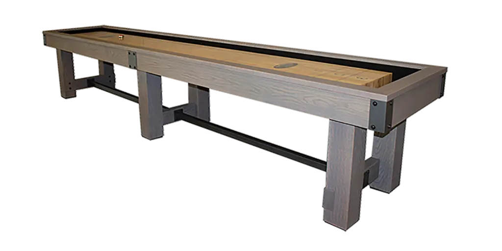 The Youngstown Shuffleboard table is made from Solid Wood and features flat paneled aprons, pedestal base legs with metal plates on apron corners and legs with metal cross bar. All Olhausen Shuffleboards are hand-crafted at our 250,000 sq. ft. manufacturing facility in Portland, TN.